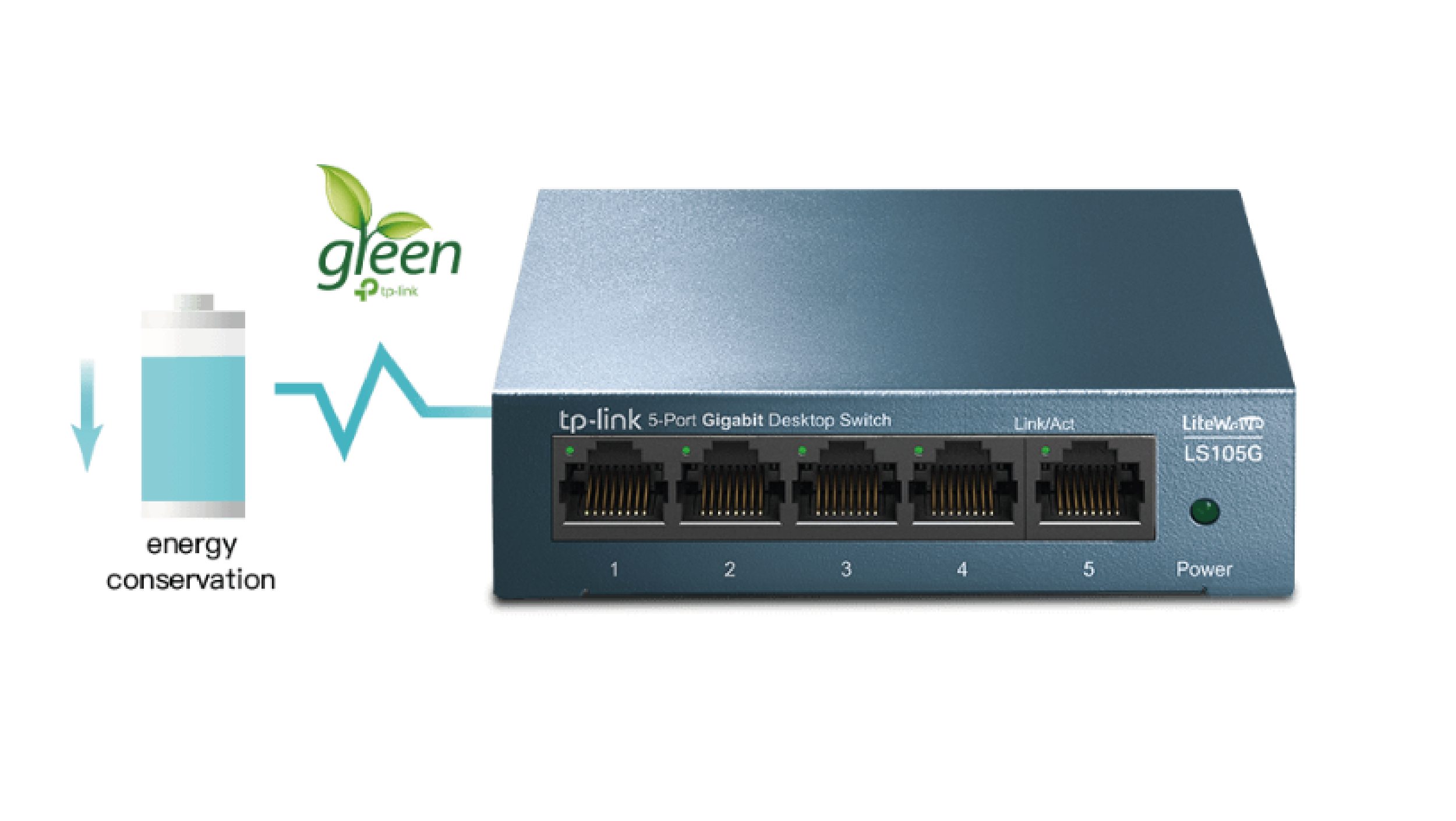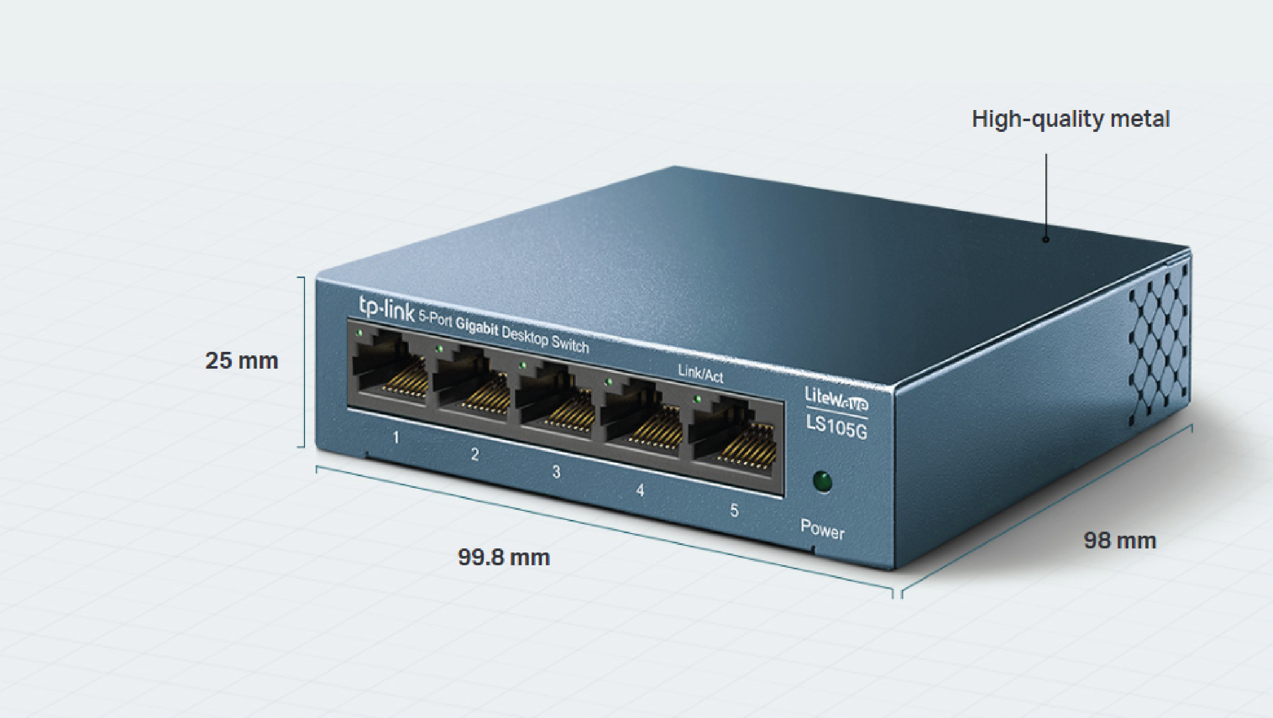 TP-Link LS105G to przełącznik (switch) z serii LiteWave wyposażony w 5 gigabitowych portów Ethernet. Wyróżnia się niewielkimi rozmiarami i małym poborem prądu - zaledwie 2,8 W. Dodatkowym atutem jest wytrzymała, metalowa obudowa, którą w razie potrzeby można zamontować na ścianie. Szybkość przekierowań pakietów wynosi 7,4 Mp/s, a rozmiar tablicy adresów MAC 2K. Switch wspiera kontrolę przepływu 802.3X oraz funkcję QoS (IEEE 802.1p / DSCP). W zestawie dołączony jest zasilacz 5 V DC, 0.6 A o niestandardowym wtyku.