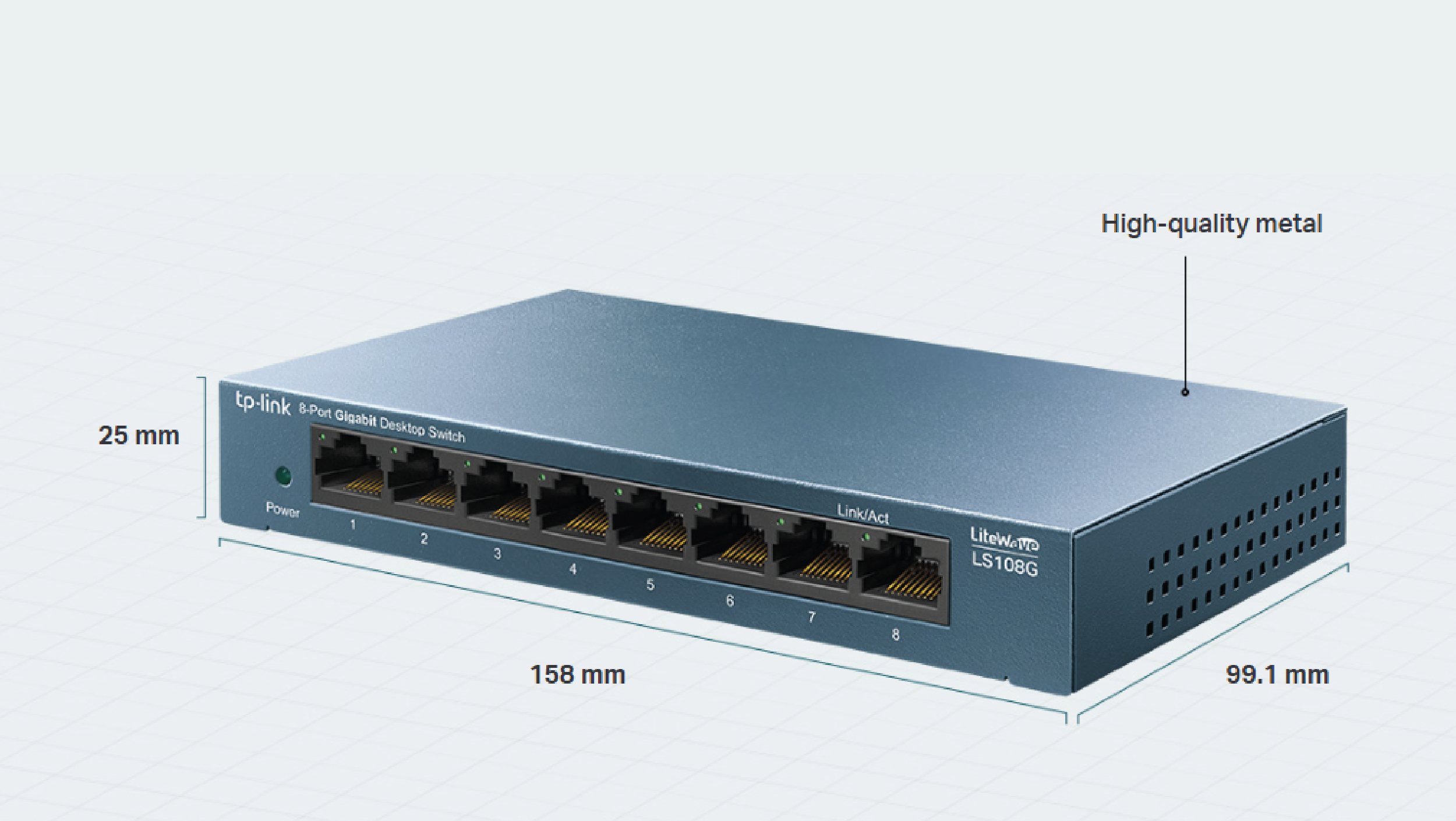 Komponenty LS108G osłonięte są metalową obudową wysokiej jakości, zapewniając trwałość produktu. Poddany rygorystycznym testom pod kątem niezawodności, przełącznik LS108G to gwarancja wysokiej wydajności przełączania. Jego kompaktowe rozmiary sprawiają, że urządzenie może być montowane na wszystkich blatach i biurkach.