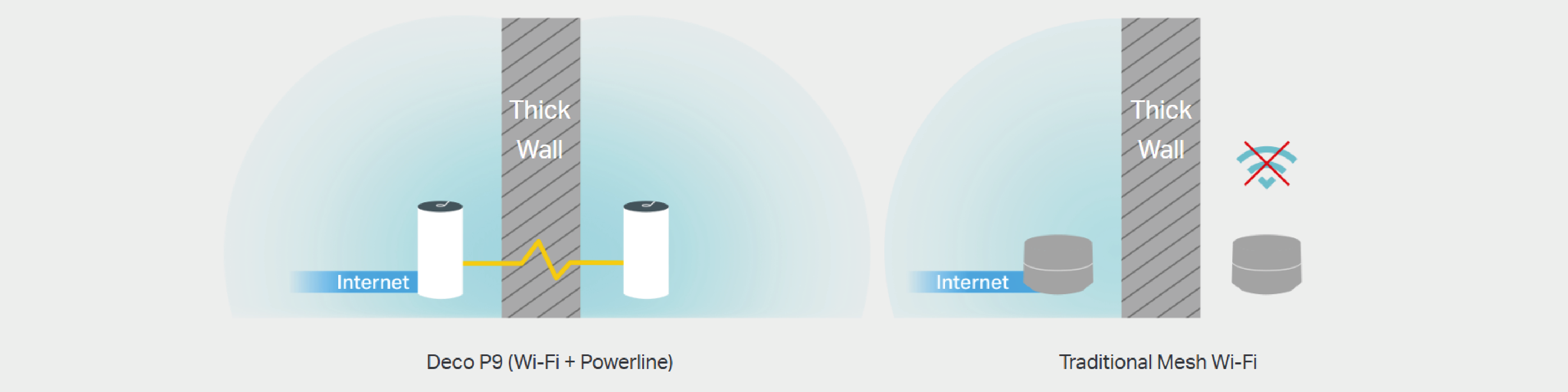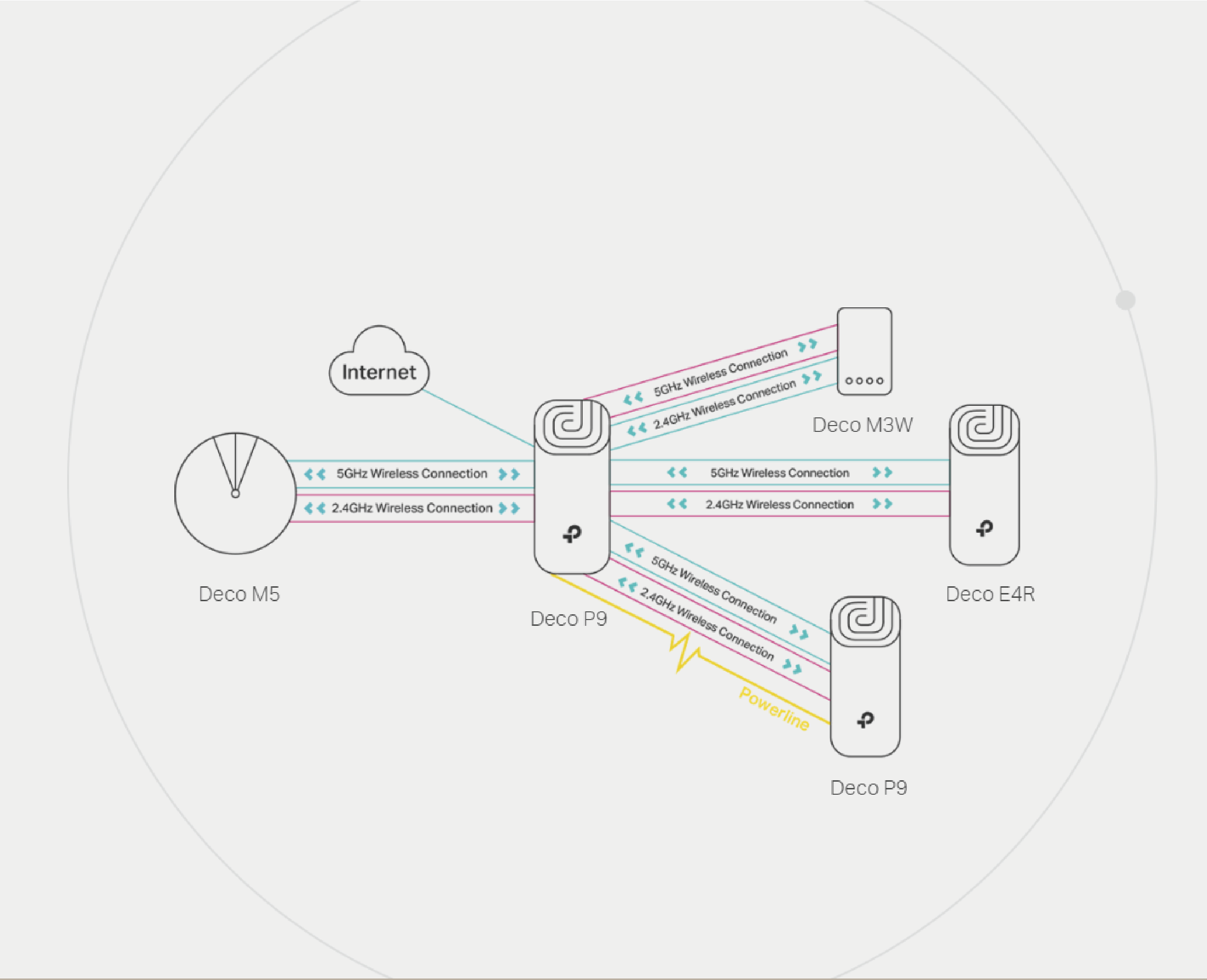 Transmisja danych pomiędzy urządzeniami Deco odbywa się na dwóch poziomach: bezprzewodowo i za pomocą sieci elektrycznej. Dzięki temu prędkość połączeń jest znacznie wyższa niż w przypadku urządzeń korzystających wyłącznie z rozwiązania Wi-Fi .