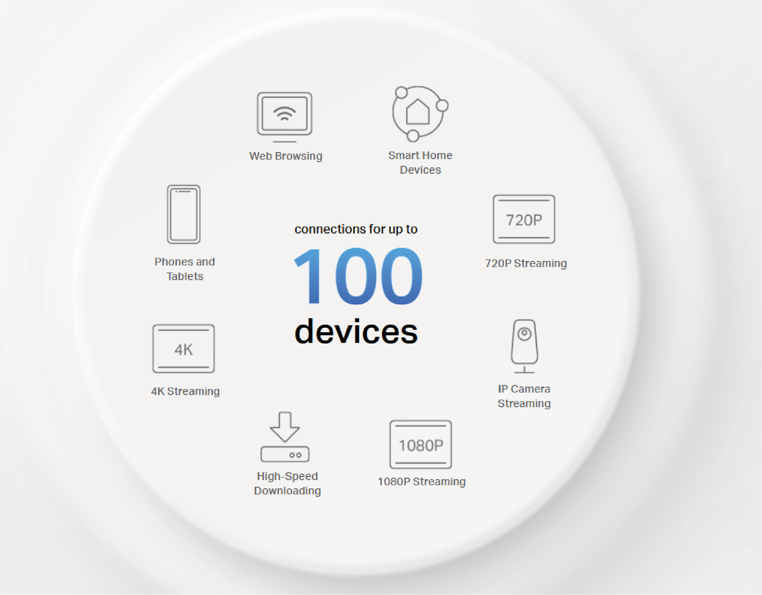 Dzięki technologii 802.11ac i prędkościom nawet trzy razy szybszym niż w starszych generacjach routerów, Deco może zapewnić szybkie połączenia bez opóźnień nawet dla 100 urządzeń.