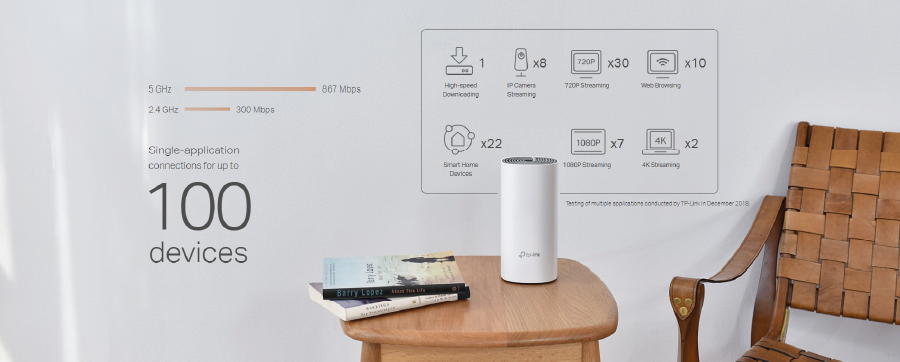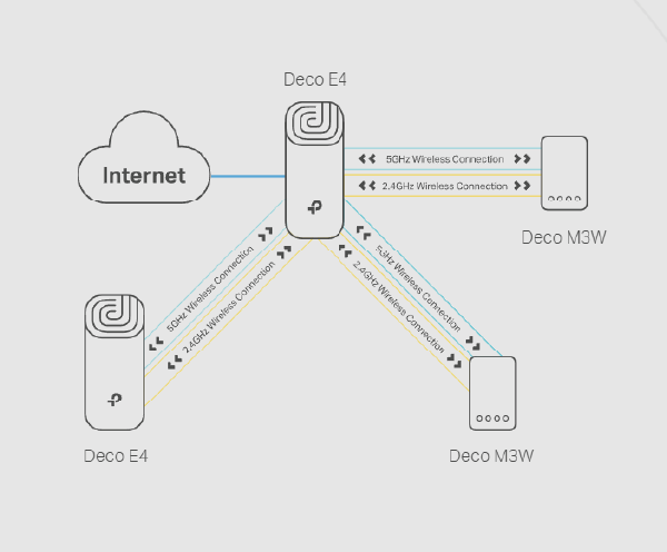 TP-Link Deco E4 to punkt dostępowy zaprojektowany z myślą o wykorzystaniu w sieci TP-Link Mesh. Może pracować jednocześnie w paśmie 2,4 i 5 GHz, obsługuje standardy IEEE 802.11 b/g/n (2,4 GHz) i IEEE 802.11 a/n/ac (5 GHz). Został wyposażony w dwa porty fast Ethernet (10/100 Mb/s), oba mogą pracować jako WAN lub LAN. Maksymalna teoretyczna przepustowość połączenia bezprzewodowego (wg producenta) wynosi 300 Mb/s w paśmie 2,4 GHz i 867 Mb/s w paśmie 5 GHz. E4 to budżetowe rozwiązanie TP-Linka do sieci Mesh, świetnie sprawdzi się w miejscach, w których nie ma potrzeby korzystania z transmisji o przepustowości większej niż 100 Mb/s. Urządzenie może pracować w trzech trybach: routera, punktu dostępowego lub wzmacniacza sygnału.