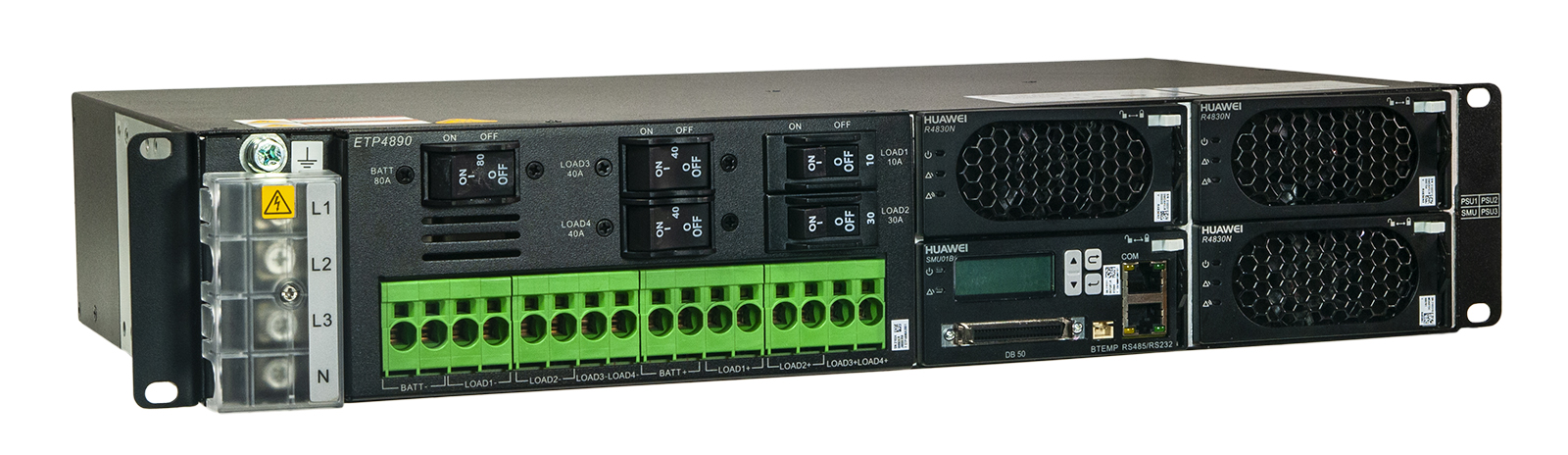 ETP4890-A2 to wydajna siłownia telekomunikacyjna wyposażona w 3 prostowniki R4830G o prądzie 30 A. Łączny prąd wyjściowy całego urządzenia wynosi 90 A, co przy napięciu 53,5 V DC daje łącznie około 4800 W mocy. Zakres napięcia wyjściowego wynosi -42 ~ -58 V DC (domyślna wartość to -53,5 V), a napięcia wejściowego 85 - 300 V AC (przy 45 ~ 66 Hz). Maksymalna ilość podłączonych obciążeń wynosi 4.