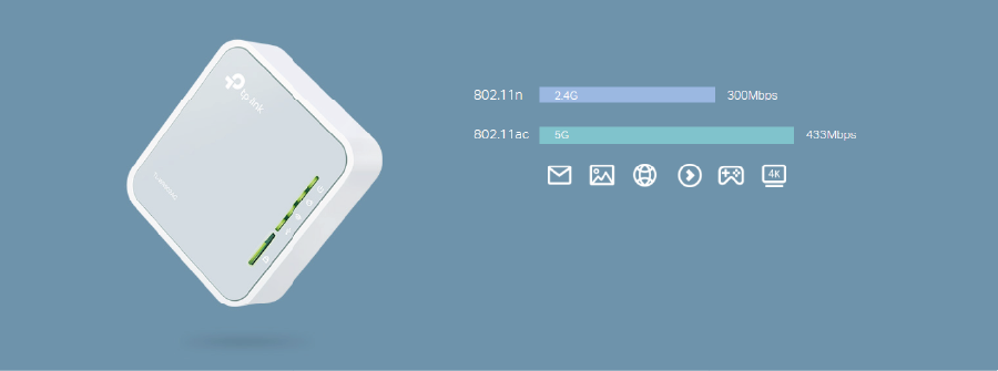 TL-WR902AC obsługuje połączenia bezprzewodowe w standardzie 802.11ac o 3 razy większej prędkości niż dotychczas dostępne połączenia w standardzie 802.11n i zapewnia łączną prędkość sieci bezprzewodowej na poziomie 733 Mb/s.