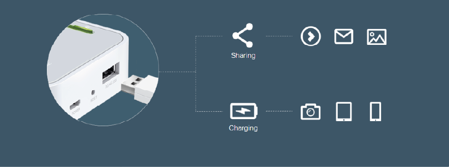 Wielofunkcyjny port USB pozwala na podłączenie zewnętrznego dysku USB, aby udostępnić pliki urządzeniom w sieci. Port USB może również dostarczyć zasilanie (do 5V/2A) urządzeniom przenośnym, co pozwala na ich wygodne ładowanie.