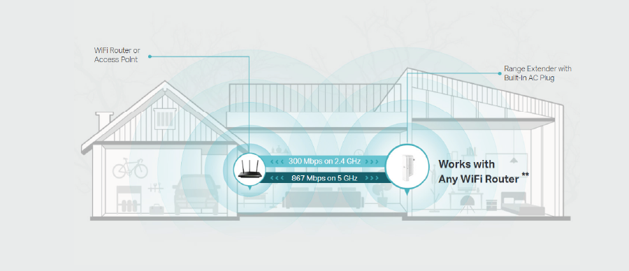 Z prędkością sięgającą 300Mb/s w paśmie 2,4 GHz i 867Mb/s w paśmie 5 GHz*1 RE300 dostarcza silne, szybkie Wi-Fi do każdego pokoju, tym samym eliminując martwe strefy.