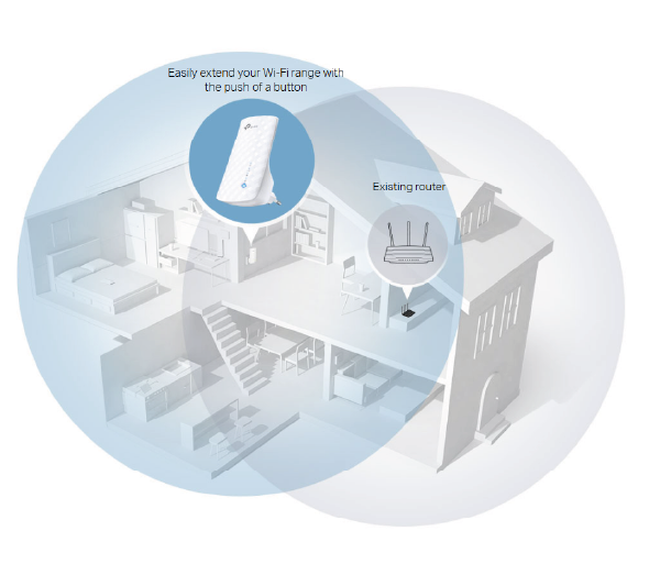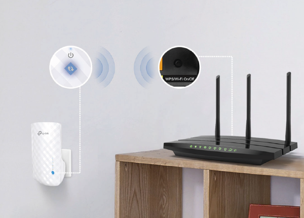 Wystarczy tylko nacisnąć przycisk WPS na routerze, a następnie w ciągu 2 minut, przycisk RE na wzmacniaczu. Po uzyskaniu połączenia z routerem możesz przenieść RE190 w dowolne miejsce, znajdujące się w zasięgu sieci bezprzewodowej.