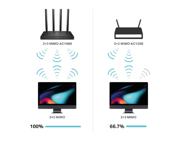 Technologia 3×3 MIMO sprawia, że Archer C80 może przesyłać i odbierać dane z wykorzystaniem aż trzech strumieni. Komputery z obsługą 3×3 — takie jak Mac — tworzą z routerem idealną parę, działając z maksymalną dla siebie wydajnością, znacznie wyższą niż w przypadku łączenia się z routerami 2×2 MIMO.