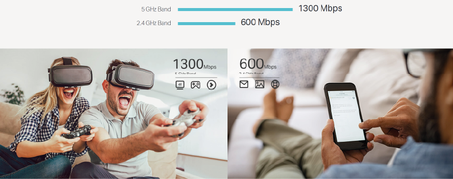 Archer C80 zapewnia dostęp do wydajnej i niedrogiej sieci Wi-Fi o łącznej prędkości 1900 Mb/s. Do wykonywania czynności obciążających sieć w niewielkim stopniu, takich jak wysyłanie wiadomości e-mail czy korzystanie z przeglądarki internetowej wystarczy pasmo 2,4 GHz, a w przypadku obsługi zadań wymagających większej przepustowości, takich jak gry internetowe lub transmisja 4K/8K UHD, idealnie sprawdzi się pasmo 5 Ghz — a wszystko to bez odczuwalnych opóźnień.