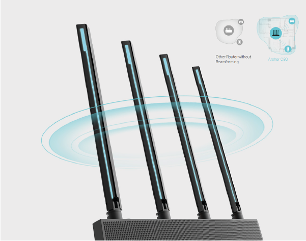 Cztery anteny zewnętrzne o wysokiej wydajności dostarczą sygnał Wi-Fi do każdego zakątka twojego domu. Technologia Beamforming umożliwia wykrywanie urządzeń i przesyłanie w ich kierunku mocnego sygnału Wi-Fi, nawet jeśli znajdują się w odległej lokalizacji lub mają niski poziom zasilania.