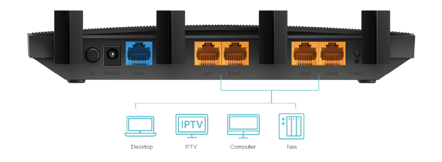 Gigabitowe porty Ethernet (1 WAN+ 4 LAN) zapewniają maksymalne prędkości przewodowe. Podłącz komputer, smart TV czy konsolę do gier i korzystaj z niezawodnych połączeń.