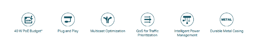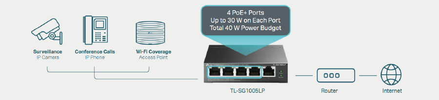 Zgodność ze standardem 802.3af/at PoE+ zapewnia możliwość oferowania do 30 W mocy na każdym porcie PoE. 40 W łącznej mocy zasilania PoE* przełącznika wyposażonego w 4 porty PoE to rozwiązanie idealne m.in. dla systemów monitoringu, biur, akademików i małych firm. Urządzenie jest w pełni zgodne z kamerami IP, punktami dostępowymi, telefonami IP, komputerami, drukarkami, itd.