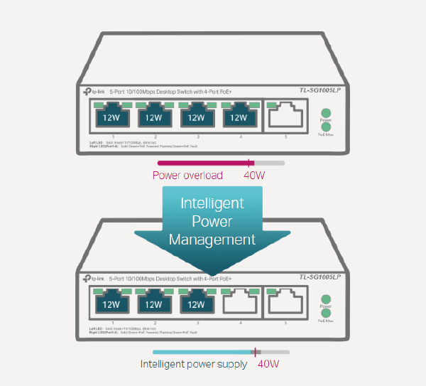 Gdy całkowity pobór mocy przekracza 40 W, funkcja inteligentnego zarządzania zużyciem energii wyłącza zasilanie portu o najniższym priorytecie, aby zapewnić zasilanie portów o wyższych priorytetach i tym samym chronić urządzenie przed przeciążeniem. Funkcja ta umożliwia także automatyczne wykrywanie wymaganej przez dane urządzenie mocy PoE i chroni urządzenia PoE jak również nieobsługujących PoE przed uszkodzeniem.