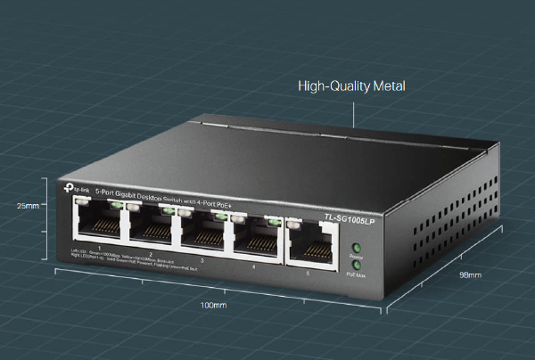 TP-Link TL-SG1005LP to niezarządzalny przełącznik typu desktop warstwy 2 (L2), przeznaczony do prostego rozszerzenia sieci i zasilania urządzeń końcowych w małych biurach lub domach. Urządzenie oferuje 5 portów Gigabit Ethernet (10/100/1000 Mb/s) RJ45. Spośród nich, 4 porty wspierają funkcję zasilania przez Ethernet (PoE Out) w standardach IEEE 802.3af i 802.3at (PoE+), z maksymalną łączną mocą budżetu PoE wynoszącą 40 W. Przełącznik posiada mechanizmy inteligentnego zarządzania energią, które chronią urządzenie przed przeciążeniem poprzez odłączenie zasilania od portu o najniższym priorytecie w przypadku przekroczenia budżetu. Jest to model Plug and Play, który nie wymaga konfiguracji, oferując automatyczne negocjowanie prędkości oraz funkcję Auto MDI/MDIX na wszystkich portach. Kompaktowa, metalowa obudowa i konstrukcja bez wentylatora (fanless) gwarantują cichą pracę i łatwość instalacji na biurku.