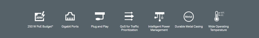 Zgodność ze standardem 802.3af/at PoE+ zapewnia możliwość oferowania do 30 W mocy na każdym porcie PoE. 250 W łącznej mocy zasilania PoE* przełącznika wyposażonego w 16 gigabitowych portów PoE+ to rozwiązanie idealne m.in. dla systemów monitoringu, biur, akademików i małych firm. Urządzenie jest w pełni zgodne z kamerami IP, punktami dostępowymi, telefonami IP, komputerami, drukarkami, itd.