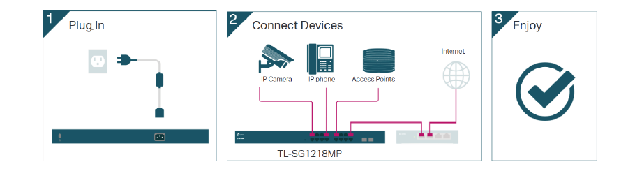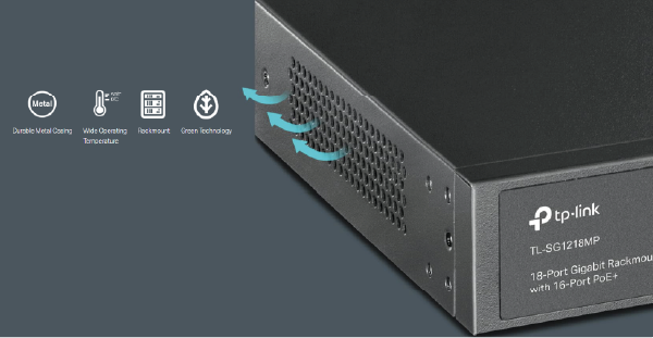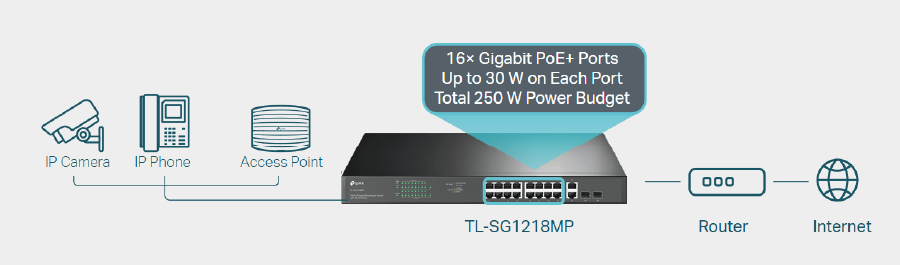 TL-SG1218MP jest w pełni kompatybilny z urządzeniami PoE, takimi jak kamery IP, Punkty dostępowe czy Telefony IP. Działa również z urządzeniami nie korzystających z PoE, aby zapewnić gigabitowe połączenia z komputerami, drukarkami i telewizją IP.