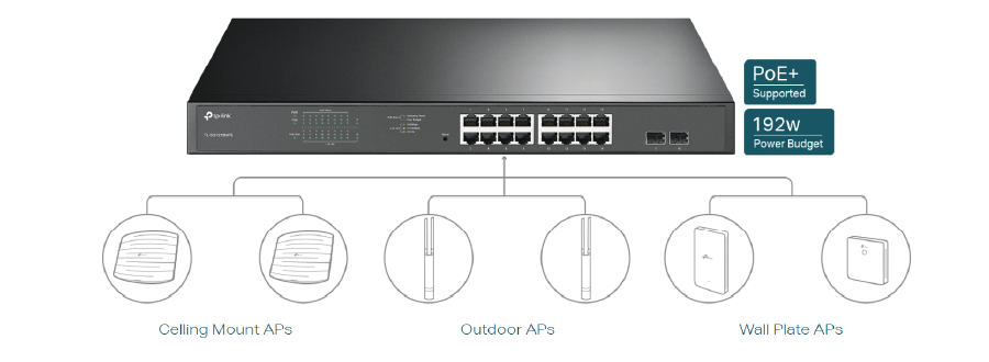 Przełącznik TL-SG1218MPE jest zgodny ze standardami 802.3af/at PoE+, a każdy z jego portów PoE zapewnia zasilanie o mocy 30 W. Całkowita moc zasilania PoE dla 16 portów PoE utrzymuje się na poziomie 192 W, co czyni urządzenie idealnym uzupełnieniem systemu monitoringu dla małych i średnich firm.