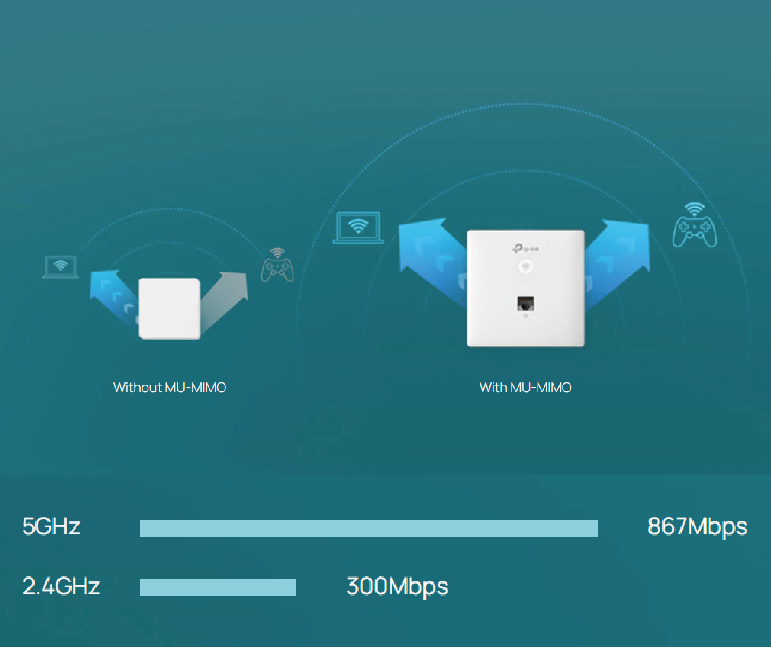 Zastosowanie technologii MU-MIMO w standardzie 802.11ac Wave 2 sprawia, że z Internetem może łączyć się więcej użytkowników w tym samym czasie. Prędkości sięgające nawet 1200 Mb/s oraz dwa pasma sieci - 2,4 GHz i 5 GHz - sprawiają, że z siecią może łączyć się więcej różnych urządzeń.