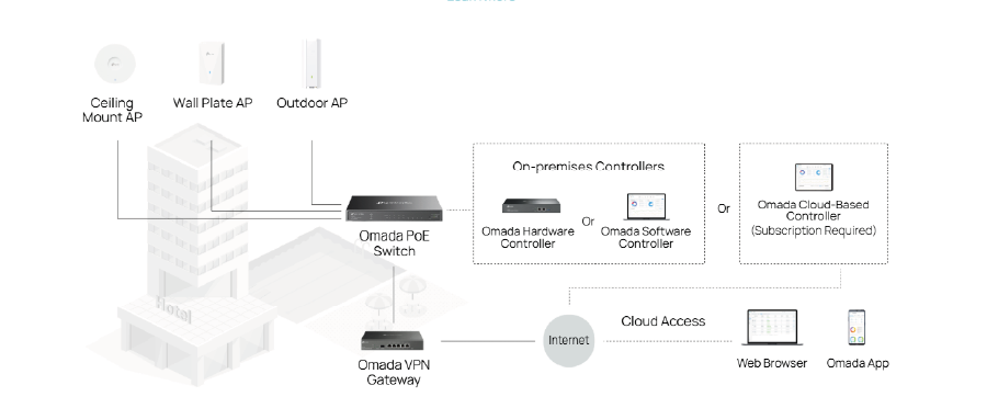| Zarządzanie centralne | • Kontroler Omada oparty na chmurze • Kontroler sprzętowy Omada (OC300) • Kontroler sprzętowy Omada (OC200) • Kontroler programowy Omada |
