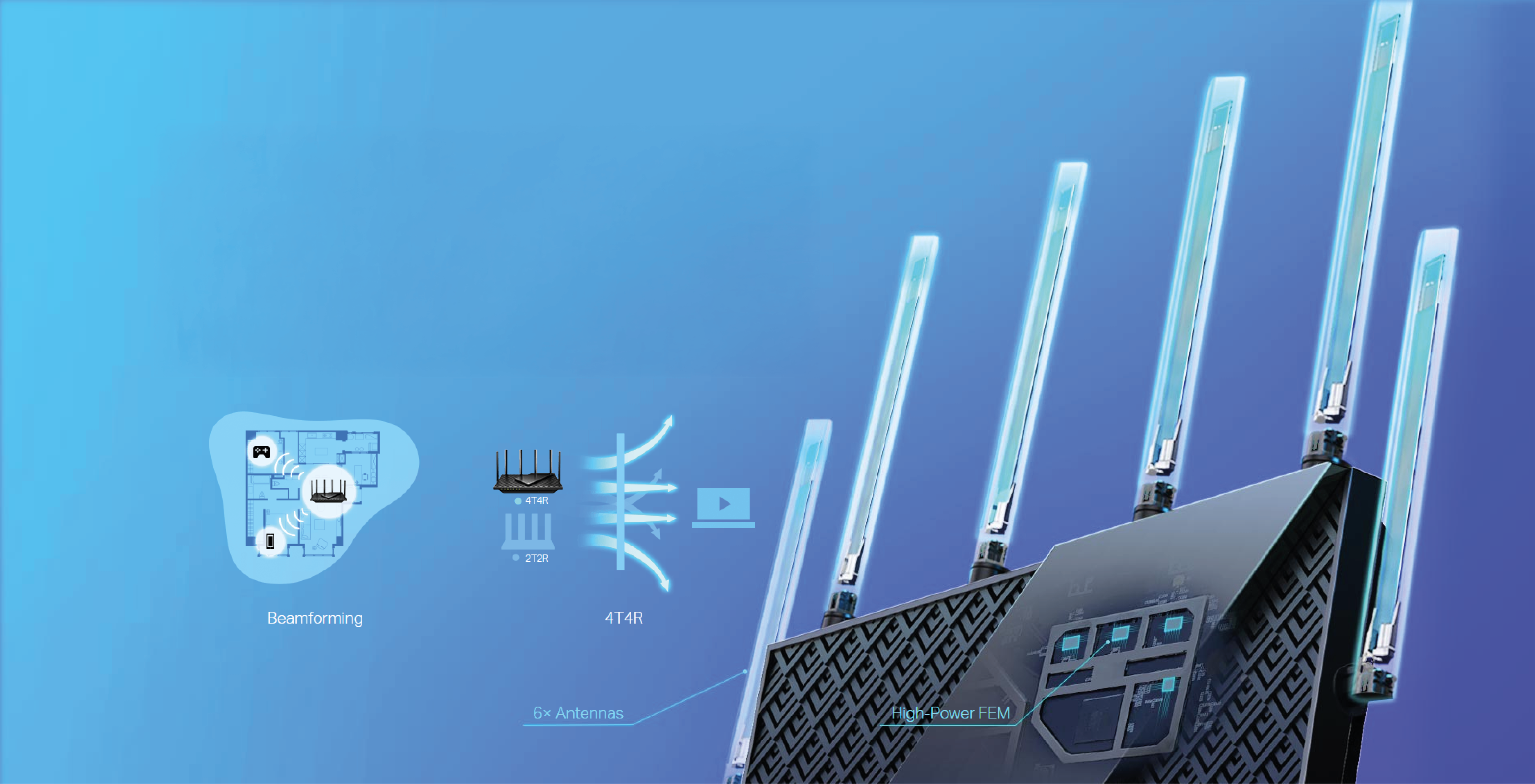 Chcesz mieć dostęp do Wi-Fi zarówno gotując obiad dla rodziny, jak i odpoczywając w zaciszu swojej sypialni? Sześć anten w połączeniu z technologią Beamforming, modułem front-end o dużej mocy i rozwiązaniem 4T4R zapewniają dostęp do niezawodnej sieci bezprzewodowej na powierzchni całego domu oraz płynne i stabilne połączenia dla wszystkich użytkowników.