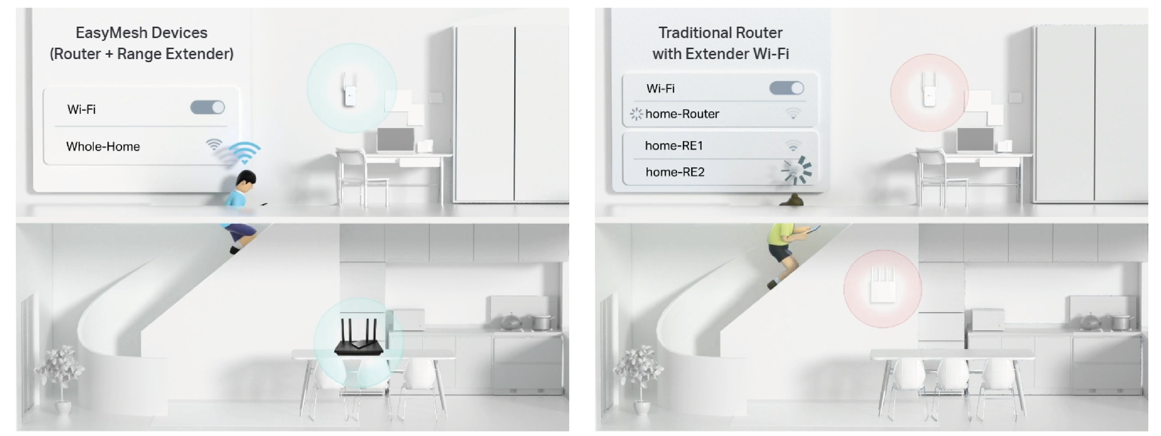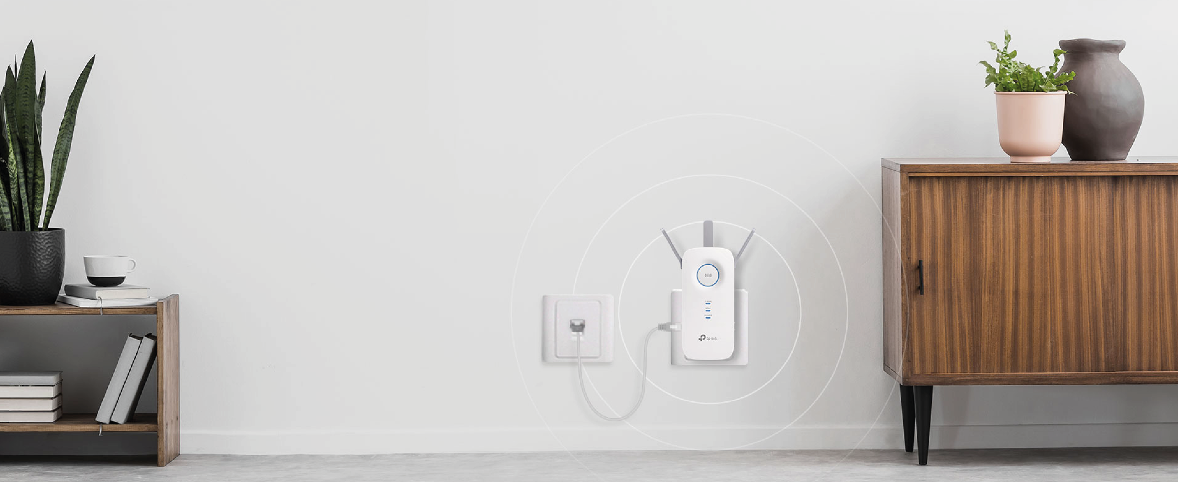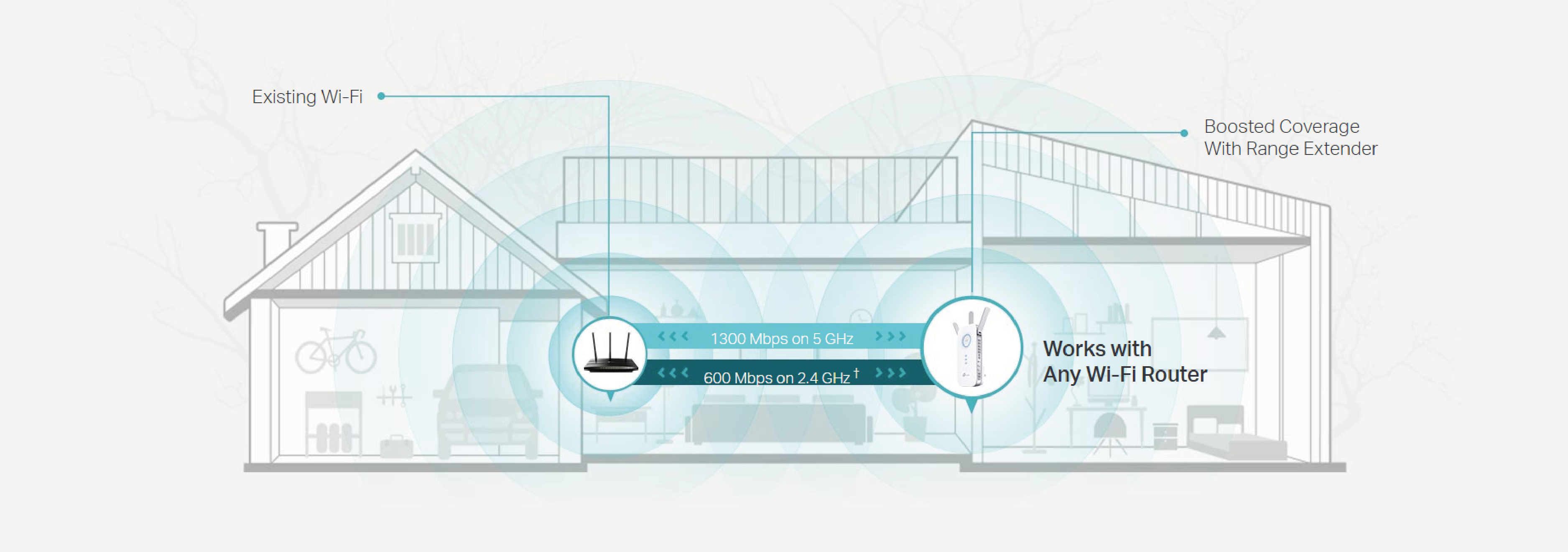 Bez odpowiedniego wsparcia router może mieć problem, by dostarczyć sygnał Wi-Fi do każdego zakamarka domu. RE550 łączy się bezprzewodowo z Twoim routerem, aby doprowadzić sygnał Wi-Fi wszędzie tam, gdzie jest to potrzebne, zapewniając kompleksowe pokrycie siecią.