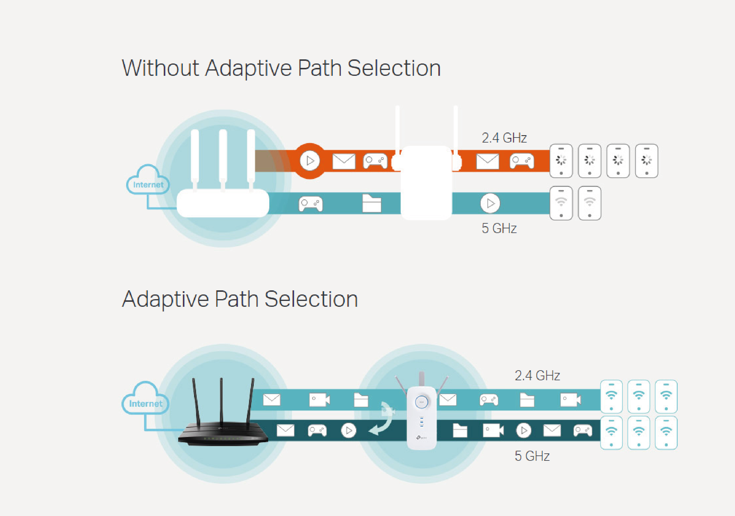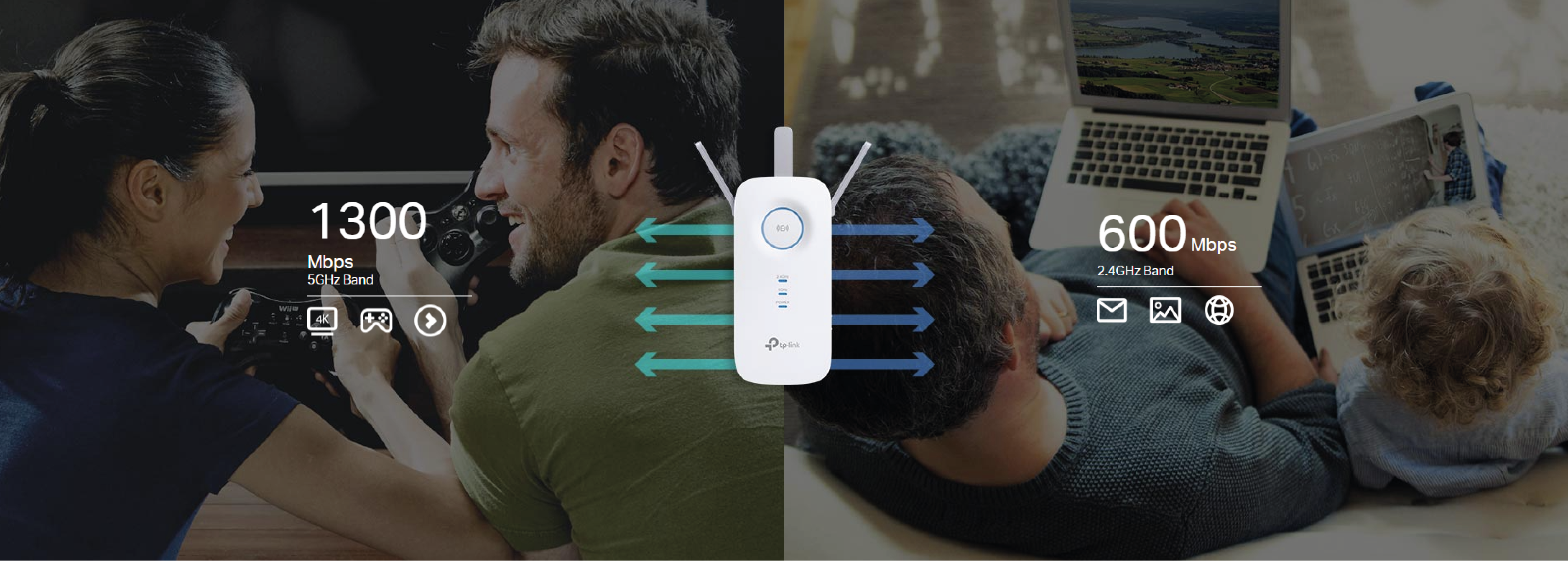 RE5500 łączy się bezprzewodowo z Twoim routerem Wi-Fi, zwiększając wydajność pasm Wi-Fi aż dwukrotnie. Zapewniając aż 600 Mb/s w paśmie 2,4 GHz i 1300 Mb/s w paśmie 5 GHz wzmacniacz umożliwia jednoczesne połączenie większej liczby urządzeń. Pasmo 2,4 GHz świetnie sprawdzi się w przypadku wysłania wielu wiadomości e-mail i surfowania po Internecie, natomiast obsługa zadań wymagających większej przepustowości, takich jak gry online lub transmisja strumieniowa w jakości HD wymaga połączenia się z pasmem 5 GHz.