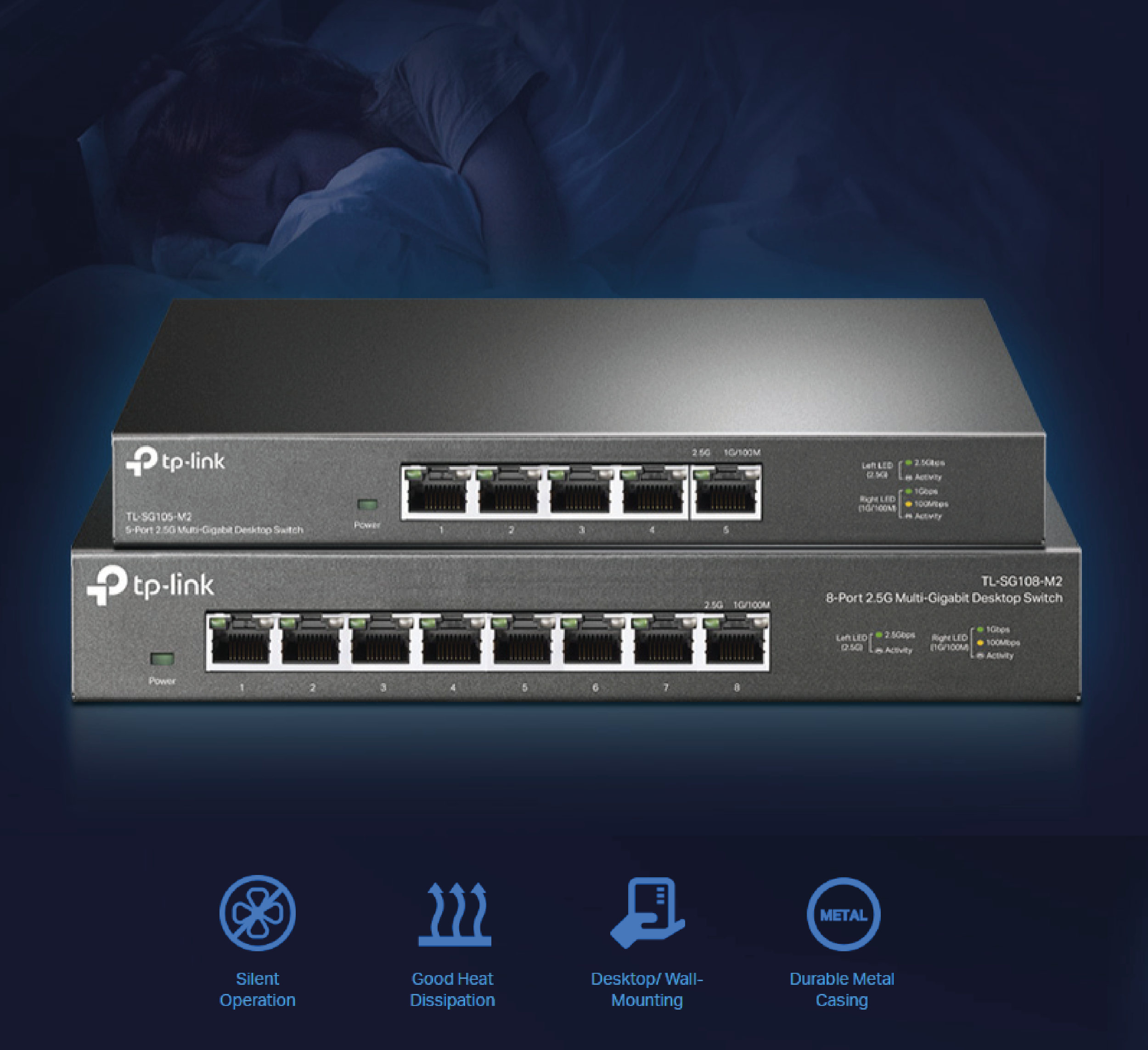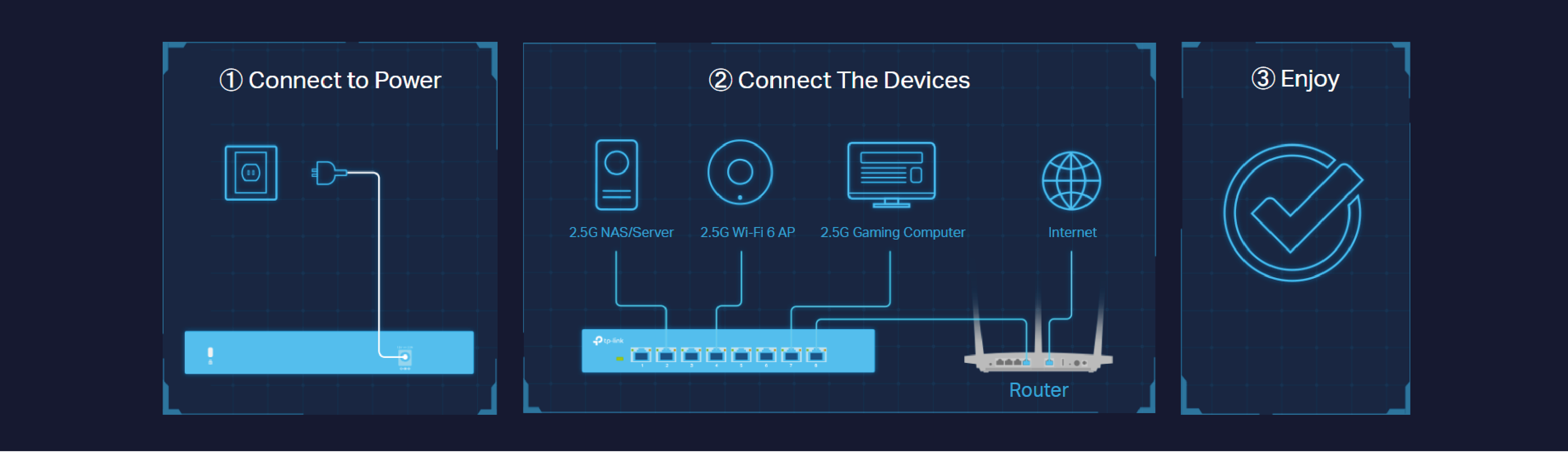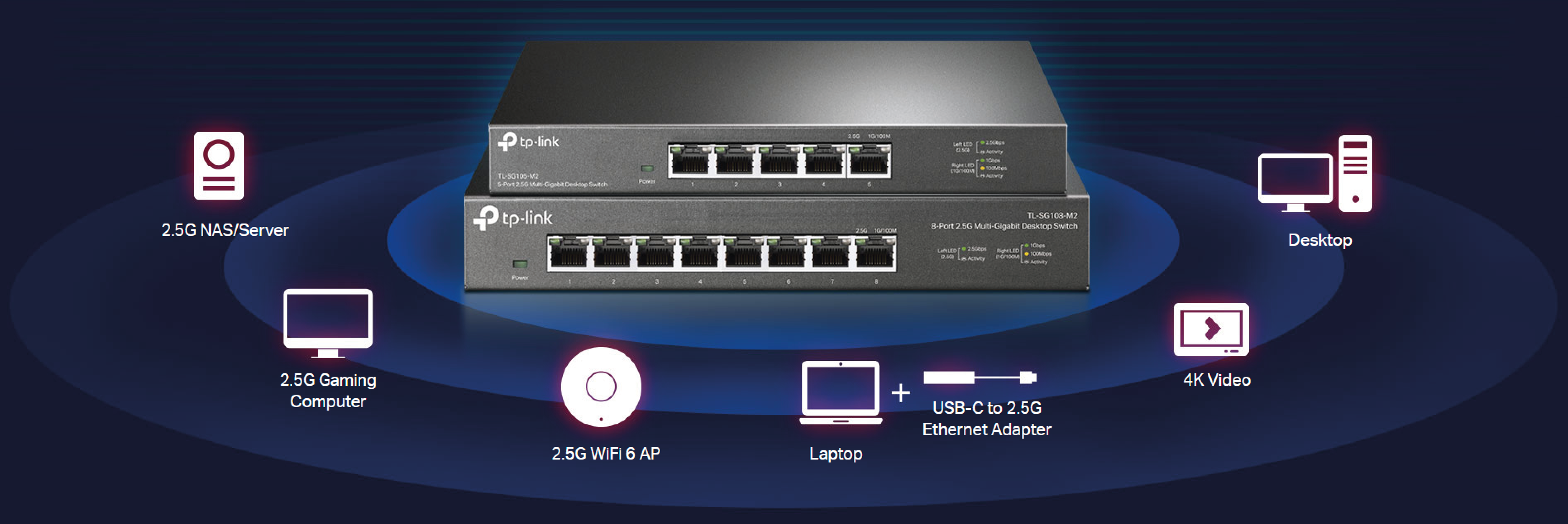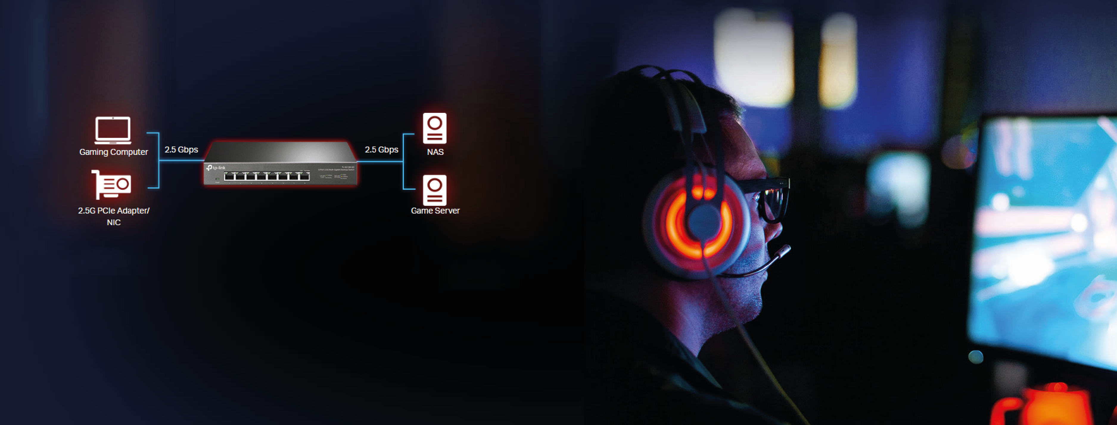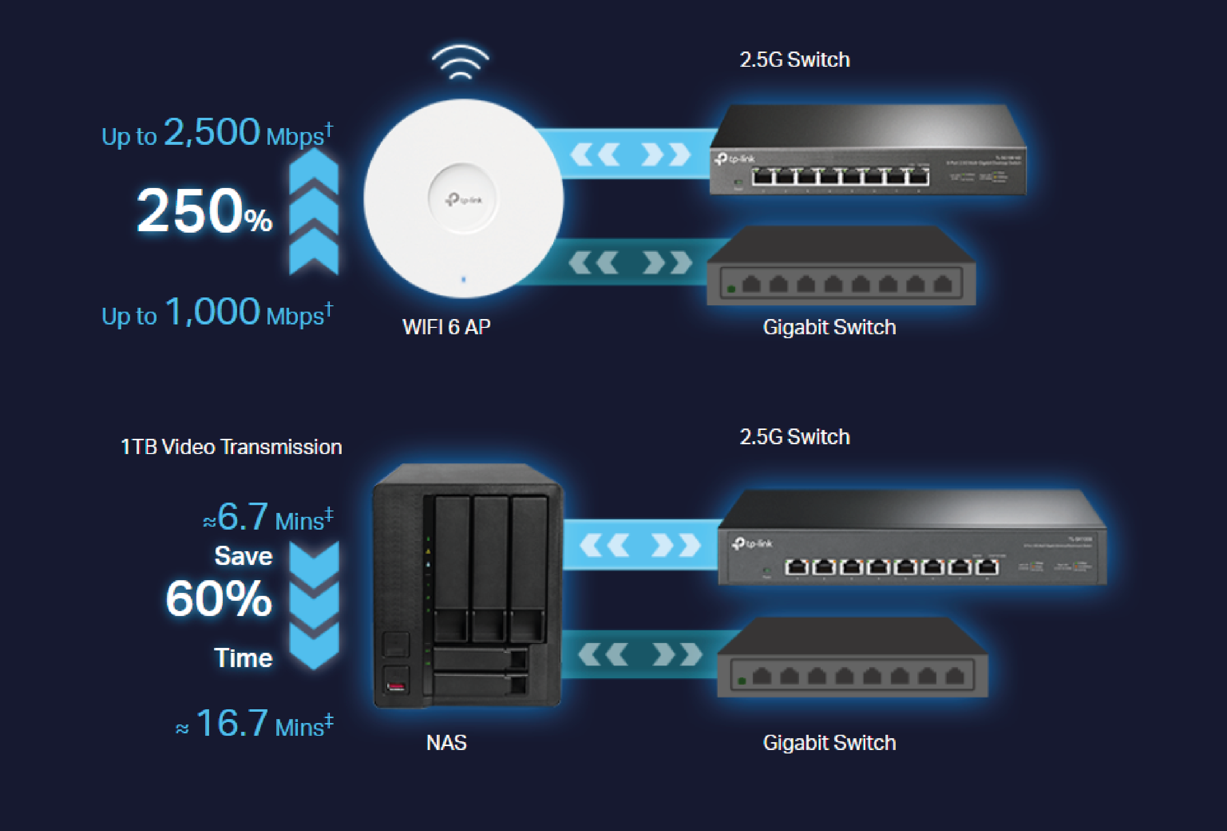 Flagowe przełączniki TP-Link wyposażone są w 5/8 portów 2,5-gigabitowych, dzięki czemu pozwalają w pełni wykorzystać potencjał sieci o wielogigabitowej przepustowości oraz zaawansowanych technologicznie urządzeń, jednocześnie zapewniając 25 Gb/s przepustowości przełączania. Dostępność trzech różnych prędkości połączeń (100 Mb/1 G/2,5 G) z autonegocjacją umożliwia wykrywanie jakości łącza i inteligentnie dostosowywanie prędkości w celu zapewnienia optymalnego działania wszystkich urządzeń, w tym NAS 2,5 G, kart sieciowych PCIe, konsol do gier, sprzętu do obsługi gier VR, punktów dostępowych Wi-Fi 6 2,5 G i wielu innych.