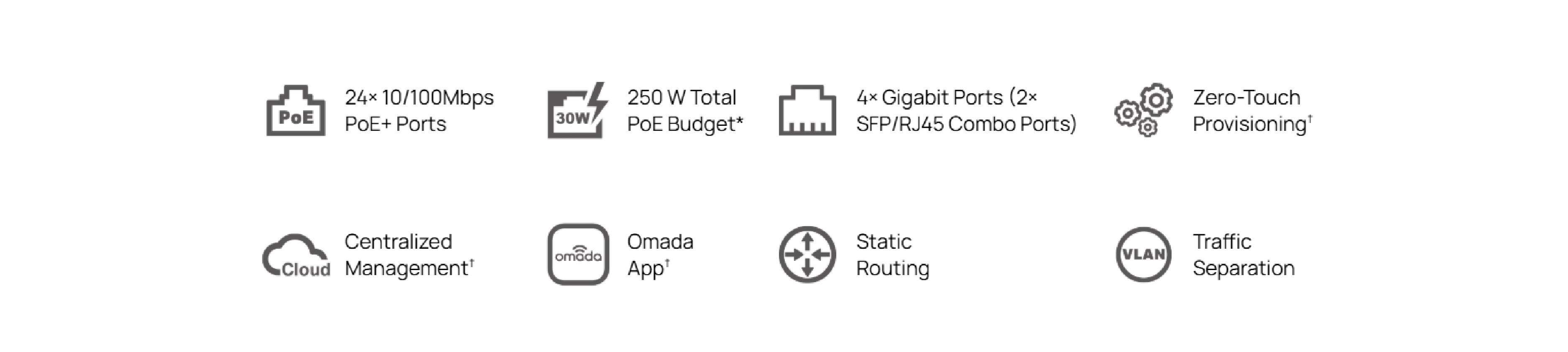 | Zawartość opakowania | Przełącznik TL-SL2428P Kabel zasilający Instrukcja instalacji Zestaw montażowy Gumowe nóżki |