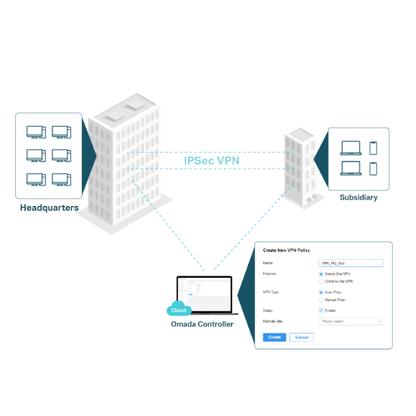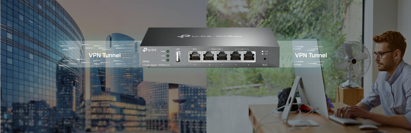 ER605 zapewnia obsługę IPSec/PPTP/L2TP VPN w oparciu o protokoły IPSec/SSL. Dzięki rozbudowanym możliwościom sprzętowym router ma zdolność obsługi do 20 połączeń LAN-to-LAN IPsec, 16 połączeń OpenVPN*, 16 połączeń L2TP oraz 16 połączeń PPTP VPN. Uruchamiana automatycznie jednym kliknięciem funkcja IPSec VPN* znacznie ułatwia proces konfiguracji sieci VPN oraz upraszcza zarządzanie siecią, jednocześnie chroniąc i szyfrując prywatną, internetową wymianę danych pomiędzy oddziałami.