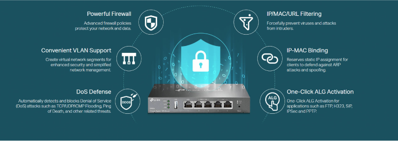 - Niezawodne zabezpieczenia: Zaawansowane reguły zapory sieciowej, ochrona przed atakami DoS, filtrowanie adresów IP/MAC/URL zapewniają ochronę sieci i danych.