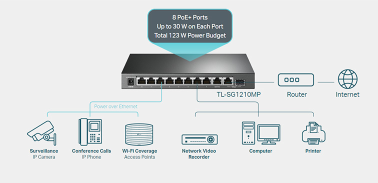 Zgodność ze standardem 802.3af/at PoE+ zapewnia możliwość oferowania do 30 W mocy na każdym porcie PoE. 123 W łącznej mocy zasilania PoE* przełącznika wyposażonego w 8 portów PoE+ to rozwiązanie idealne m.in. dla systemów monitoringu, biur, akademików i małych firm. Urządzenie jest w pełni zgodne z kamerami IP, punktami dostępowymi, telefonami IP, komputerami, drukarkami, itd.