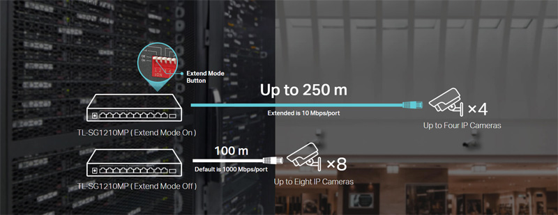 W trybie Extend zasięg transmisji PoE sięga nawet 250 m*, dzięki czemu przełącznik jest doskonałym rozwiązaniem w przypadku rozmieszczania kamer IP na dużym obszarze.