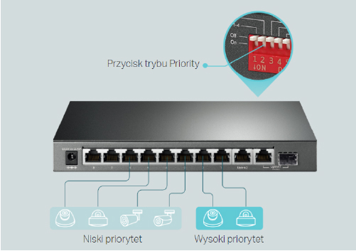 Możliwość nadania wyższych priorytetów portom 1–2 za pomocą trybu Priority gwarantuje wysoką jakość aplikacji wrażliwych na opóźnienia, takich jak nagrania wideo lub połączenia głosowe.