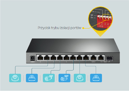 Tryb izolacji w łatwy sposób rodziela ruch dla portów 1-4 lub 5-8 aby uniknąć Snoopingu, Tamperingu i izoluje Broadcast Storm w celu zapewnienia większego bezpieczeństwa.