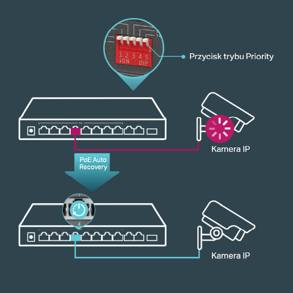 Przełącznik automatycznie wykrywa i uruchamia ponownie urządzenia PoE, takie jak kamery i punkty dostępowe, gdy przestaną działać lub odpowiadać. Gwarantuje to stabilność działania podłączonych urządzeń PoE bez potrzeby monitorowania i ręcznego restartowania.