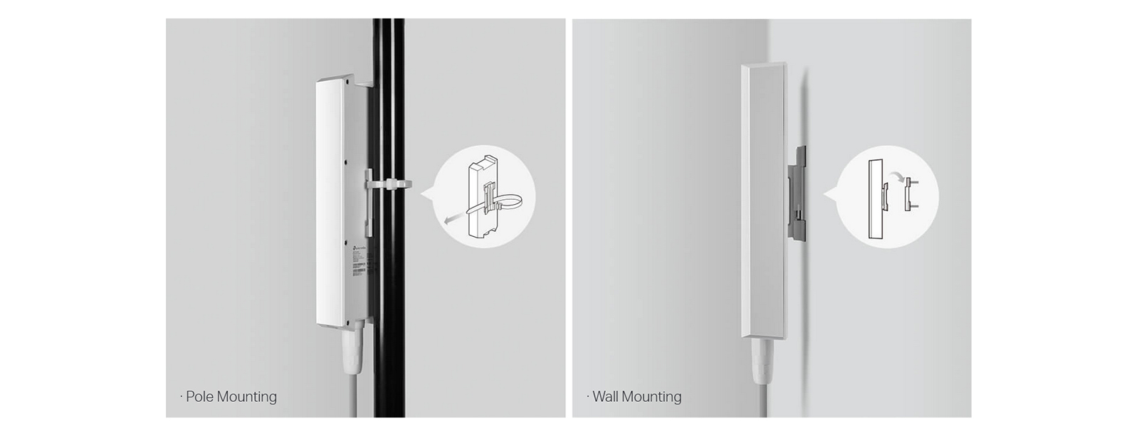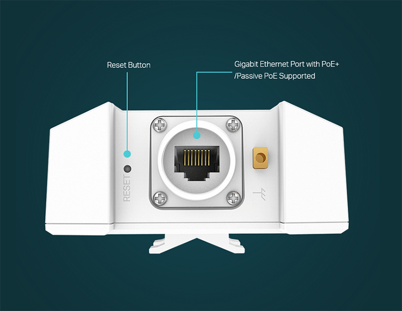 Punkt dostępowy posiada obudowę przystosowaną do montażu na zewnątrz budynków, wyróżnia się wysokim stopniem ochrony - IP67. Przy pomocy akcesoriów znajdujących się w zestawie możesz zamontować go na słupie lub ścianie. Zastosowano 1 gigabitowy port Ethernet, zasilanie odbywa się poprzez pasywne PoE 48V DC lub PoE w standardzie IEEE 802.3af.