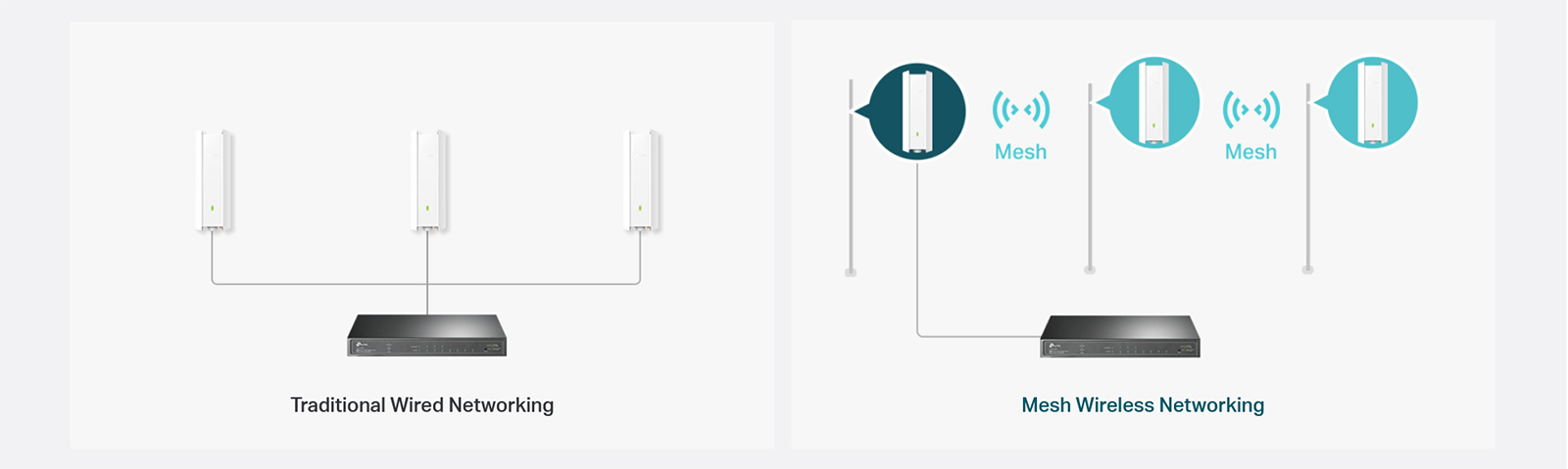 EAP610-Outdoor podobnie jak inne urządzenia z serii Omada EAP obsługuje technologię Mesh. Może komunikować się z innymi punktami dostępowymi bezprzewodowo, bez wykorzystania kabli Ethernet. Jest to bardzo przydatne z lokalizacjach, w których poprowadzenie kabli stanowi problem.