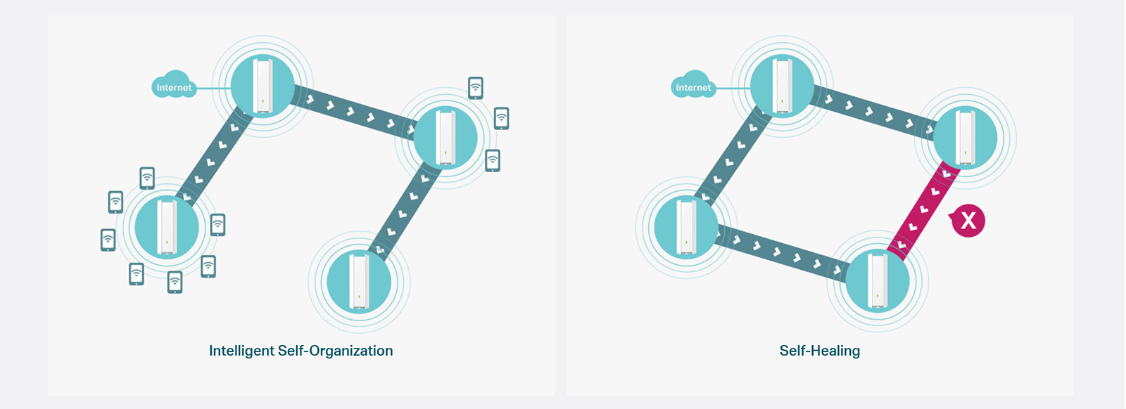 W przypadku korzystania z funkcji Mesh system Omada automatycznie optymalizuje pracę urządzeń i wybiera najlepsze połączenie pomiędzy poszczególnymi punktami dostępowymi. W przypadku awarii któregoś z połączeń próbuje znaleźć zastępcze, aby cała sieć nadal funkcjonowała.