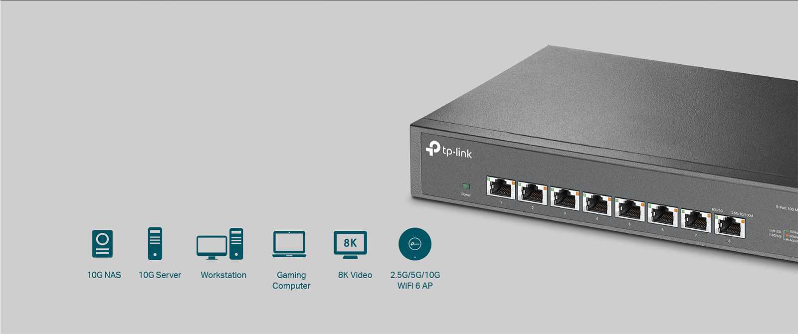 | Porty | 8 Portów 100Mb/s / 1Gb/s / 2,5Gb/s / 5Gb/s / 10Gb/s (Autonegocjacja) Auto-MDI/MDIX |