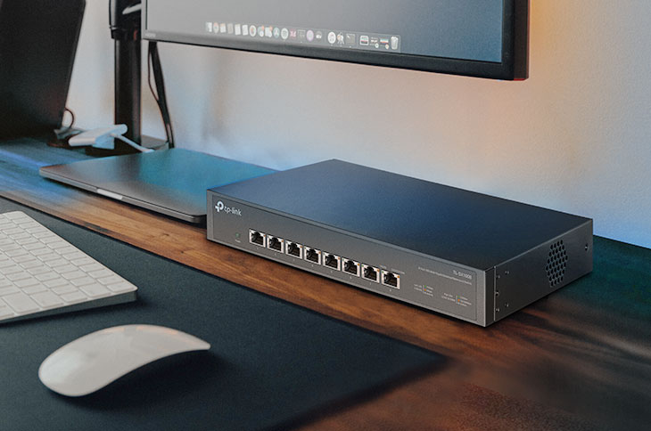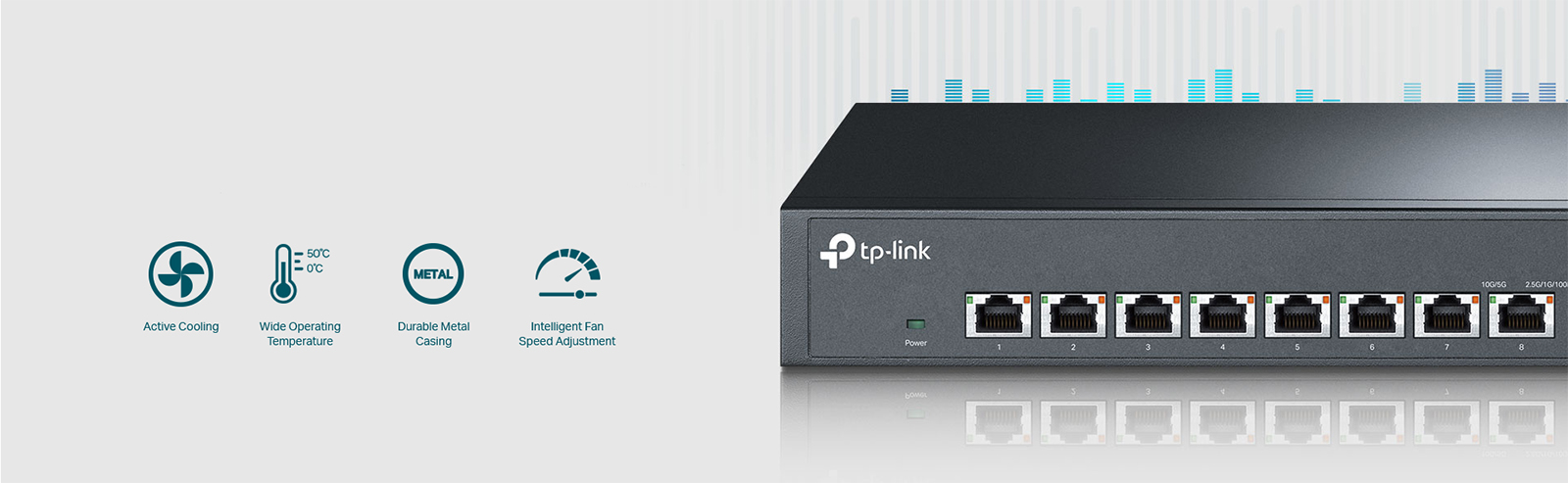 TP-Link SX1008 to switch wyposażony w 8 portów 10G Ethernet. Zapewnia bardzo dużą wydajność przełączania - 160 Gb/s i prędkość przekazywania pakietów - 119 Mp/s. Doskonale sprawdzi się w sieciach, które są przystosowane do transmisji 10 Gb/s. Każdy z portów wspiera automatyczną negocjację i może pracować z przepustowością 100 / 1000 / 2500 / 5000 / 10000 Mb/s. Obudowa została przystosowana do montażu w szafie Rack 19", dzięki niewielkim rozmiarom sprawdzi się także w użyciu desktopowym, na biurku lub półce. Switch posiada wbudowany zasilacz AC oraz aktywne chłodzenie (1 wentylator), maksymalny pobór mocy wynosi 31,2 W.