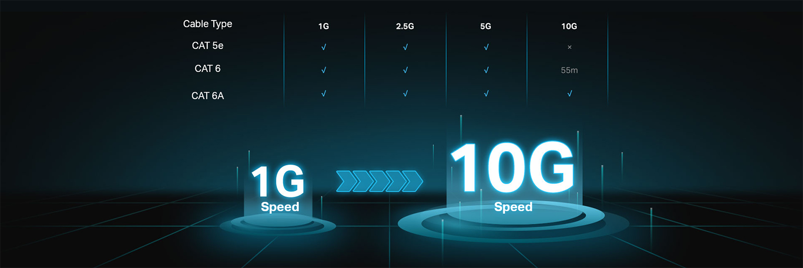 Korzystając z portów Ethernet podczas zmiany sieci na standard 10 Gb/s nie musisz wymieniać od razu całego okablowania! Na krótszych odcinkach wystarczy ci nawet kabel w standardzie 5e, na dłuższe dystanse sprawdzi się kat. 6 lub wyższa.