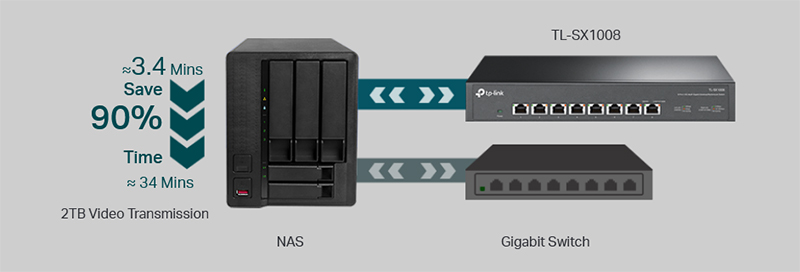Dzięki przepustowości 10 Gb/s możesz bardzo szybko transferować pliki z serwera wykorzystując sieć lokalną. Nie musisz już długo czekać aż zostanie wykonana kopia zapasowa konfiguracji, z SX1008 cała procedura skończy się w mgnieniu oka.