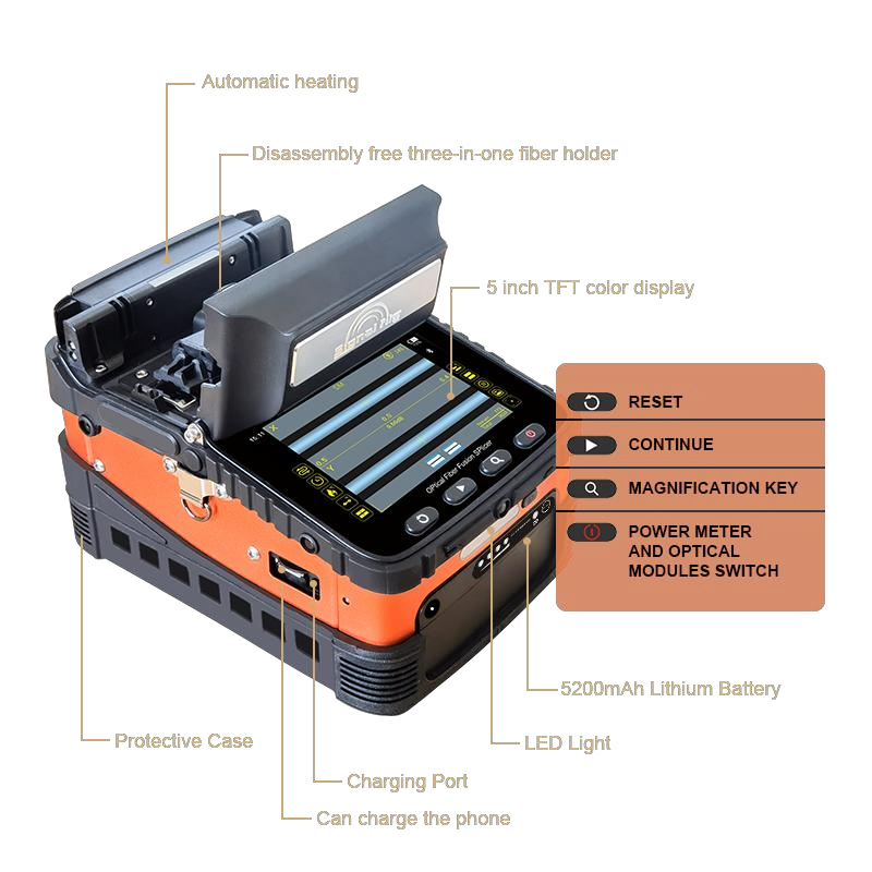 Oferowany produkt wspiera centrowanie do rdzenia, typowy czas wykonania spawu wynosi 8 s, a czas wygrzewania osłonki 18 s. Piecyk działa w sposób automatyczny, po zamknięciu pokrywy pokrywy od razu zaczyna wygrzewanie. Urządzenie jest wyposażone w 6 silniczków, które służą do pozycjonowania włókien w różnych płaszczyznach.