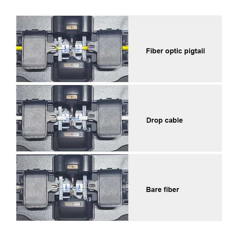 Spawarka jest wyposażona w holdery, które możesz wykorzystać do pigtaili optycznych, kabli typu drop (wraz z powłoką) i gołego włókna światłowodowego. Po umieszczeniu włókien w holerach spawarka automatycznie zbliża je do siebie i centruje.