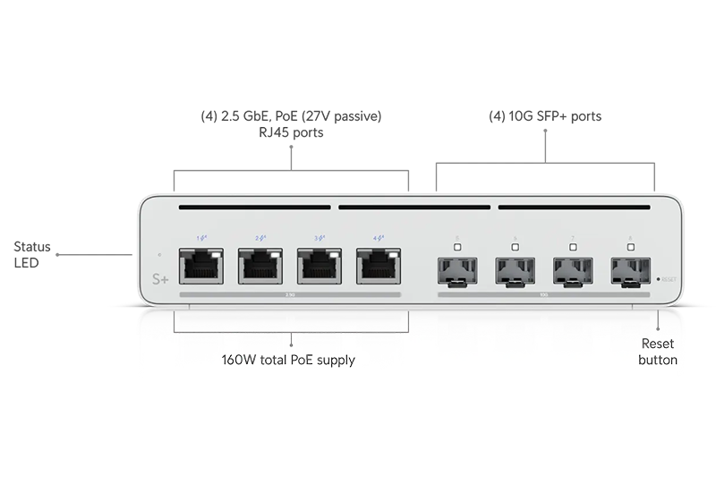 Switch został wyposażony w 4 porty 2.5G Ethernet (1 / 2,5 Gb/s) oraz 4 sloty SFP+ (1 / 10 Gb/s). Łączna przepustowość wynosi 50 Gb/s, a prędkość przekazywania pakietów 74,4 Mp/s.