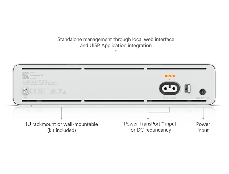 Z tyłu obudowy znajdują się dwa wersją zasilania - standardowe gniazdo DC i TransPort. W zestawie znajdziesz zasilacz z wtykiem DC. Zastosowanie dwóch portów umożliwia stworzenie redundancji zasilania - jeden port podejmie pracę w przypadku awarii drugiego.