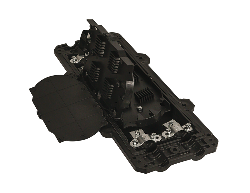 Wewnątrz mufy znajdziesz dwie tacki spawów, w każdej możesz umieścić maksymalnie 24 spawy, co łącznie daje 48. Zaraz za otworami wejściowymi / wyjściowymi znajdują się specjalne opaski, przy pomocy których możesz przykręcić kabel i zapobiec jego poruszaniu się.