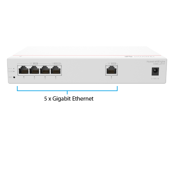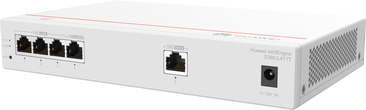 Huawei S380-L4T1T to gateway z serii eKitEngine. Łączy w sobie funkcje routera i zarządzalnego switcha Layer 3, został wyposażony w 5 gigabitowych portów Ethernet, w tym 1 port WAN i 4 porty LAN. Maksymalna przepustowość przełączania wynosi 8 Gb/s, a przepustowość egress 2 Gb/s. S380-:L4T1T jest w stanie obsłużyć do 200 użytkowników, wspiera serwer / klienta DHCP, klienta DNS, klienta PPPoE, ACL oraz NAT. Zarządzanie odbywa się z poziomu graficznego interfejsu Web, aplikacji lub SSH. Zastosowano obudowę typy desktop i pasywne chłodzenie. Gateway posiada gniazdo DC, jest przystosowany do zewnętrznego zasilacza 12 V / 1 A, maksymalny pobór mocy to zaledwie 6,11 W. S380-L4T1T to podstawowy gateway do wykorzystania w sieciach opartych o rozwiązania eKitEngine. Zapewnia dużą wydajność przy jednoczesnym zachowaniu atrakcyjnej ceny i niewielkiego poboru mocy.