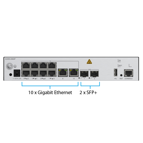 Huawei AC650-256AP to urządzenie łączące w sobie kontroler punktów dostępowych (WAC) oraz switcha. Może zarządzać jednocześnie do 256 AP, sprawdzi się więc w wielu różnego rodzaju sieciach. Został wyposażony w 10 gigabitowych portów Ethernet (10/100/1000 Mb/s) oraz 2 sloty SFP+ (10 Gb/s), Jest w stanie obsłużyć ruch 10 Gb/s, co ma znaczenie w przypadku dużych sieci. AC650-256AP ma wbudowany serwer AAA/Portal, zapewnia uwierzytelnianie poprzez portal lub 802.1X. Możesz go skonfigurować w trybie in-path, off-path, bridge lub mesh z połączeniami Layer 2 lub Layer 3. Obsługuje backupowe połączenia kilku WAC - 1+1 HSB oraz N+1 backup. System udostępnia administratorowi bogate narzędzia związane z wykrywaniem błędów i diagnostyką. Znacznie ułatwia i przyspiesza zarządzanie siecią w sposób scentralizowany, np. poprzez szybką konfigurację podłączanych punktów dostępowych.