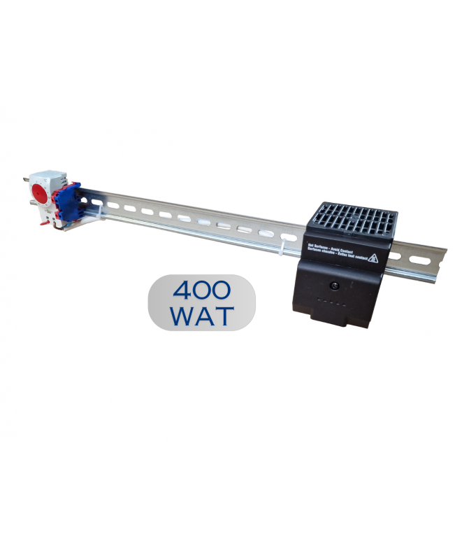 Oferowany produkt to zestaw grzejny z termostatem przeznaczony do wykorzystania w szafach Mantar z serii SZK. Nic nie stoi na przeszkodzie aby stosować go również z produktami z innej serii. Składa się z termostatu o mocy 400 W (grzałka CSL-028-400W-230V), rezystora oraz radiatora. Wszystkie elementy są przystosowane do montażu na szynie DIN ST35. Produkt należy zamontować w dolnej części szafy, przy podłodze.